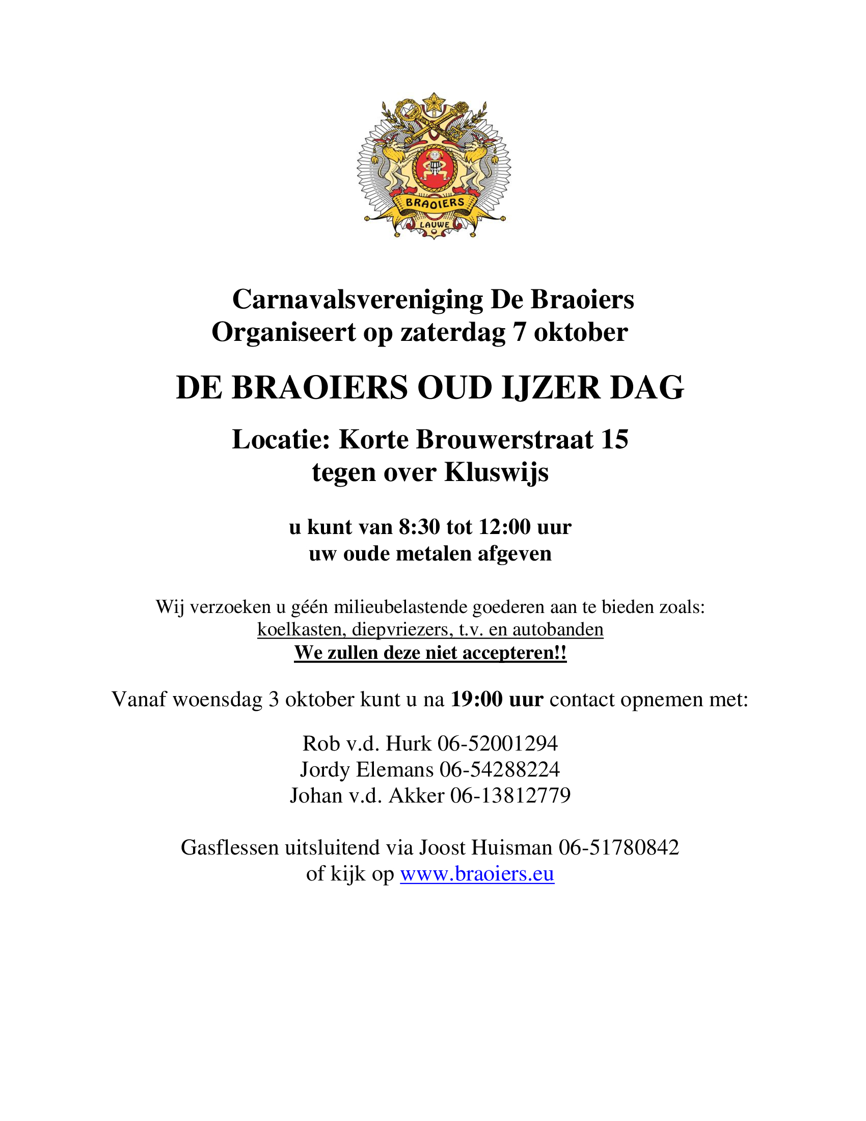 Al het oud ijzer e.d. kunt u bezorgen aan de korte brouwerstraat 15. De mensen van de Braoiers zijn te herkennen aan hun Braoiers cap.